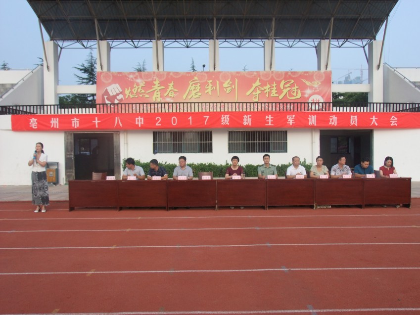 8月23日上午7:00,亳州十八中2017年新生在宽阔而美丽的运动场举行了军训动员大会。党总支书记、校长宋耘,副校长梁彩霞,党总支副书记、副校长孙德兴,党总支副书记郭飞峰及各科室负责人,军训教官负责人等领导出席了会议。梁彩霞主持动员大会。