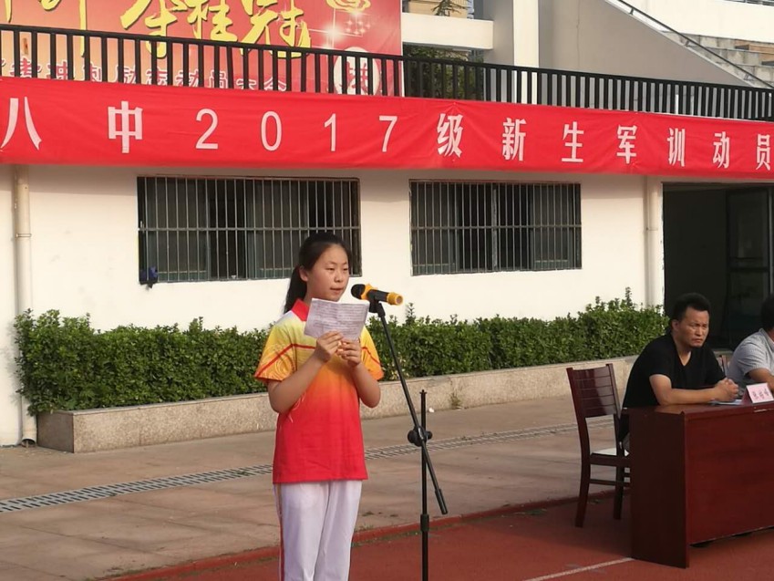 高一(12)班马静姝同学代表全体新生在会上作了发言,她表示:军训是同学们学习军队优良传统、培养艰苦奋斗精神的极好机会,也是大家磨练意志、提高修养、增强体质的实践课堂,同学们必当端正态度、服从命令、顽强拼搏、收获成功。