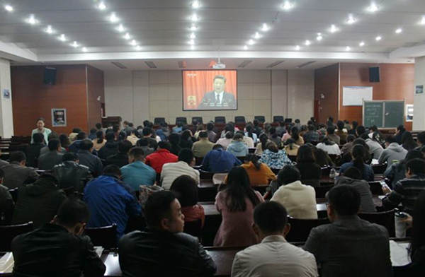 10月18日上午九点,全体教职工在至真厅集中观看中国共产党第十九次全国代表大会开幕会。大家目不转睛地观看,聚精会神地聆听,并不时在笔记本上做着记录,领悟着报告精神。三个半小时过去了,老师们依然精神饱满,兴致浓厚,没有一人提前离场。