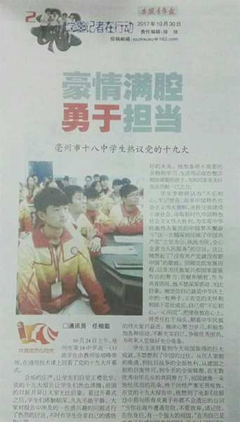 办公室、党建室对本次活动进行了及时的宣介,通过新媒体和网站连续发表三篇新闻报道:《亳州十八中组织教职工认真收看十九大开幕会直播盛况 》、《 亳州十八中全体教职工共同收看十九大开幕式现场直播 》、《豪情满腔 勇于担当 亳州十八中学子认真观看十九大开幕式》。