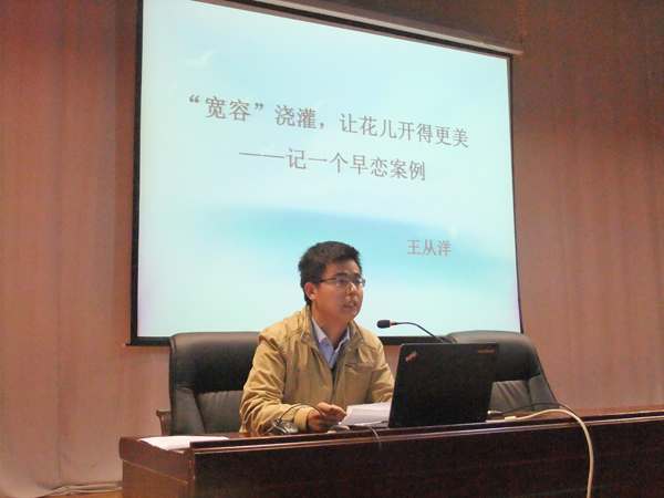 王从洋、张金龙、杨盼三位班主任分别结合自己的工作经历讲述了如何处理学生早恋、如何营造良好班风、如何让学生意识到学习的重要性等问题。三位班主任语言质朴、列举事例生动,分享的方法切实可行,给全体班主任带来很大收获。