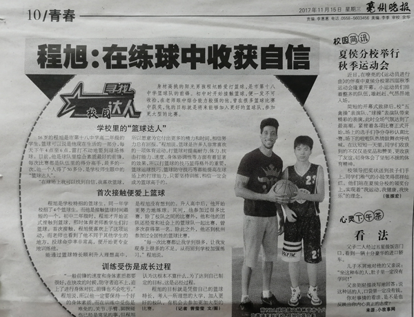 又悉,篮球社团明星球员程旭被亳州晚报报道,成为全市中学生“校园达人”,刻苦的训练让他成为球队里综合素质最好的前锋,多次代表学校参加比赛,并取得优异成绩。