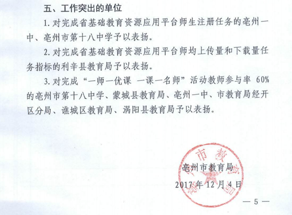 近日,亳州十八中在亳州市教育局关于2017年一师一优课和省基础教育资源平台应用情况的通报中获得表扬,被评为工作突出单位。