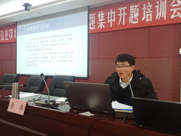 课题组核心成员李方坤从课题的背景、价值和目标、研究内容、过程及方法、可行性分析及成果预期五个方面进行了详细阐述。报告提出打造一个安全、稳定、环保、节能的智慧校园,以适应我校即将到来的走班制教学模式,利用技术支持,实现教育教学过程中教、学、考、评、管各环节的高效开展。