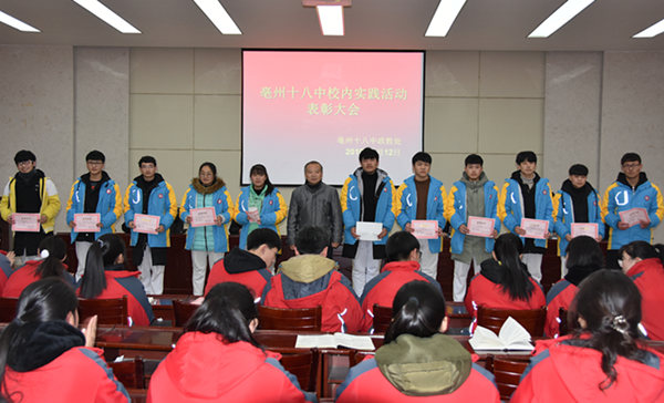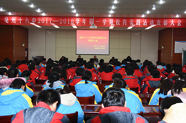 1月12日,亳州十八中隆重召开校内实践活动表彰大会。会议由政教处主任何立宏主持,副校长孙德兴、督导室主任郭飞峰出席会议,并为表现优秀的班级和个人颁奖。