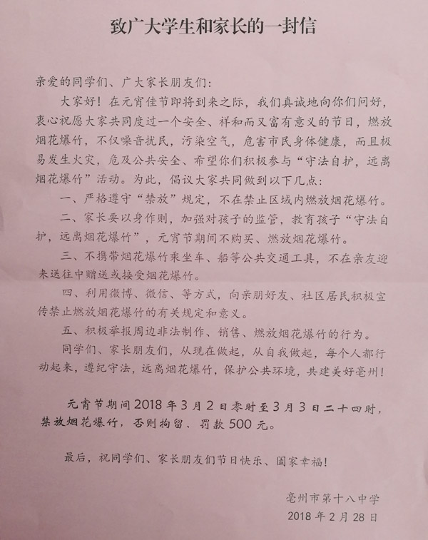 副校长孙德兴宣读了相关通知并部署了具体任务,要求总务处做好相关宣传工作,班主任张贴并下发《亳州市第十八中学致广大学生和家长的一封信》,对学生和家长同时进行宣传教育,力保每个人都严格遵守禁止燃放烟花爆竹的规定。
