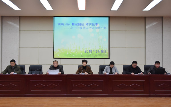 3月9日,亳州十八中高一年级举行考试学情分析会,校长宋耘,副校长梁彩霞、孙德兴出席会议,会议由教科研中心主任王士忠主持。