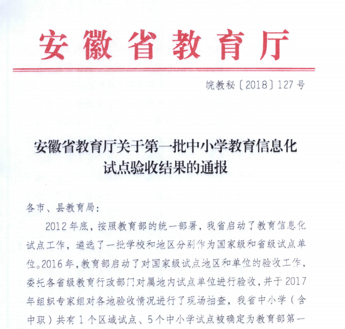 2012年底,按照教育部的统一部署,我省启动了教育信息化试点工作,遴选了一批学校和地区分别作为国家级和省级试点单位。2017年,省教育厅组织开展了对省级中小学信息化试点单位的验收,亳州十八中在验收中被评为中小学信息化试点优秀单位。