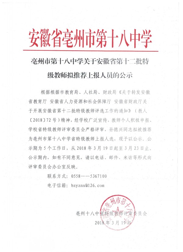 亳州市第十八中学关于安徽省第十二批特级教师拟推荐上报人员的公示