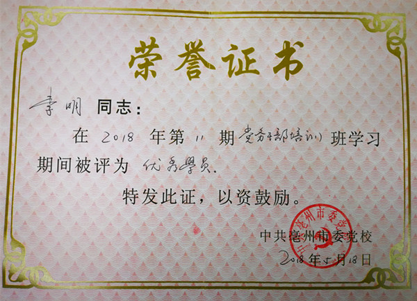 亳州十八中教师李明被中共亳州市委党校评为优秀学员