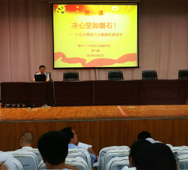 6月25日,亳州十八中召开全体教职工会议,党总支副书记郭飞峰在会上为全体教职工上了一堂题为《决心坚如磐石!十九大释放八大重磅反腐信号》的微型党课。