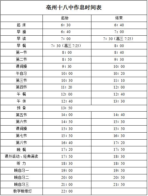 亳州十八中作息时间表 编辑:原创 发布时间:2018-02-20 11:14 浏览次数:4249次 注:1. 早读:班主任辅导。 2. 每周一早操为升旗仪式,结束后全体学生朗读感恩词。 3. 听力由学校统一播放,按时收听。 自2018年2月22日开始执行 分享到: